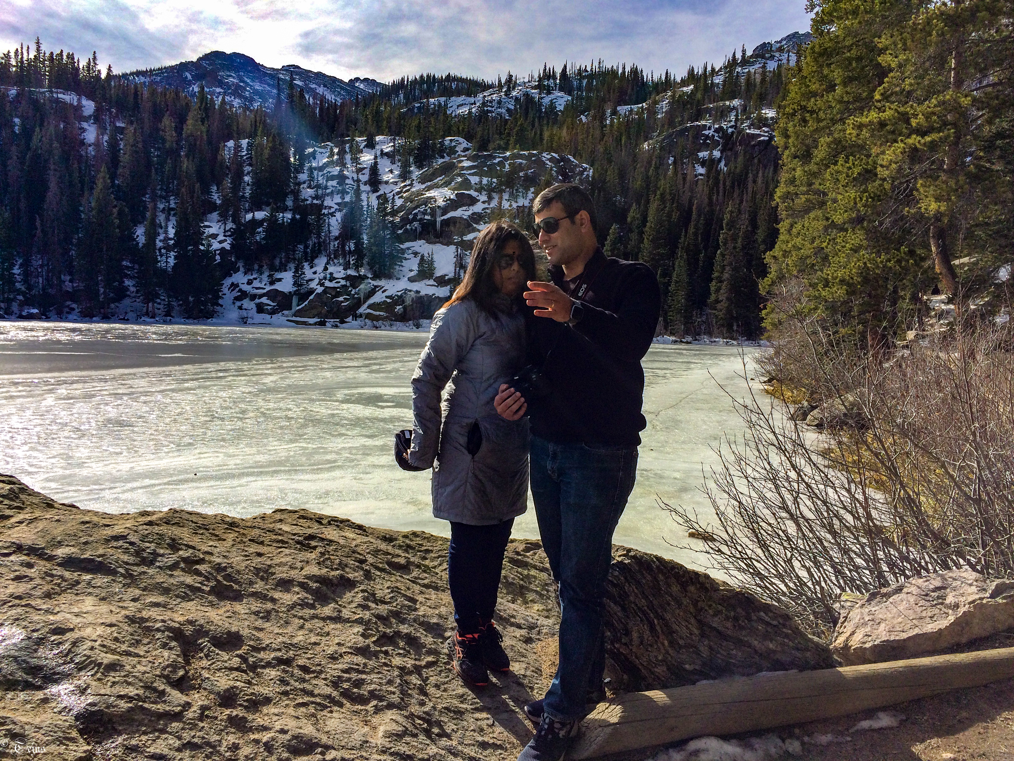 We arrived at Bear lake and just about managed to find a parking slot, we were welcomed with ice and a very slippery surface. The dumb tourist that I was, I had left my snow shoes and jackets in our suitcases and come dressed like we were going for a joy ride. I had no idea that the Lake was close to 10,000 feet from sea level! The wife (the smarter one) was dressed right
